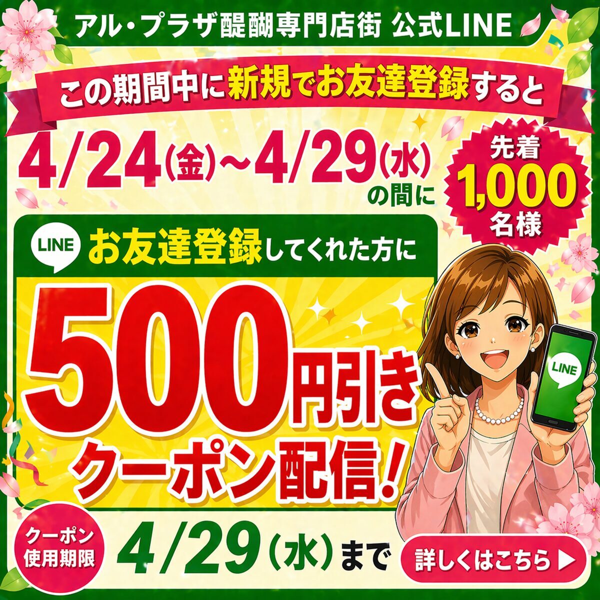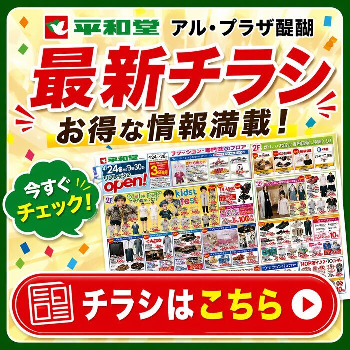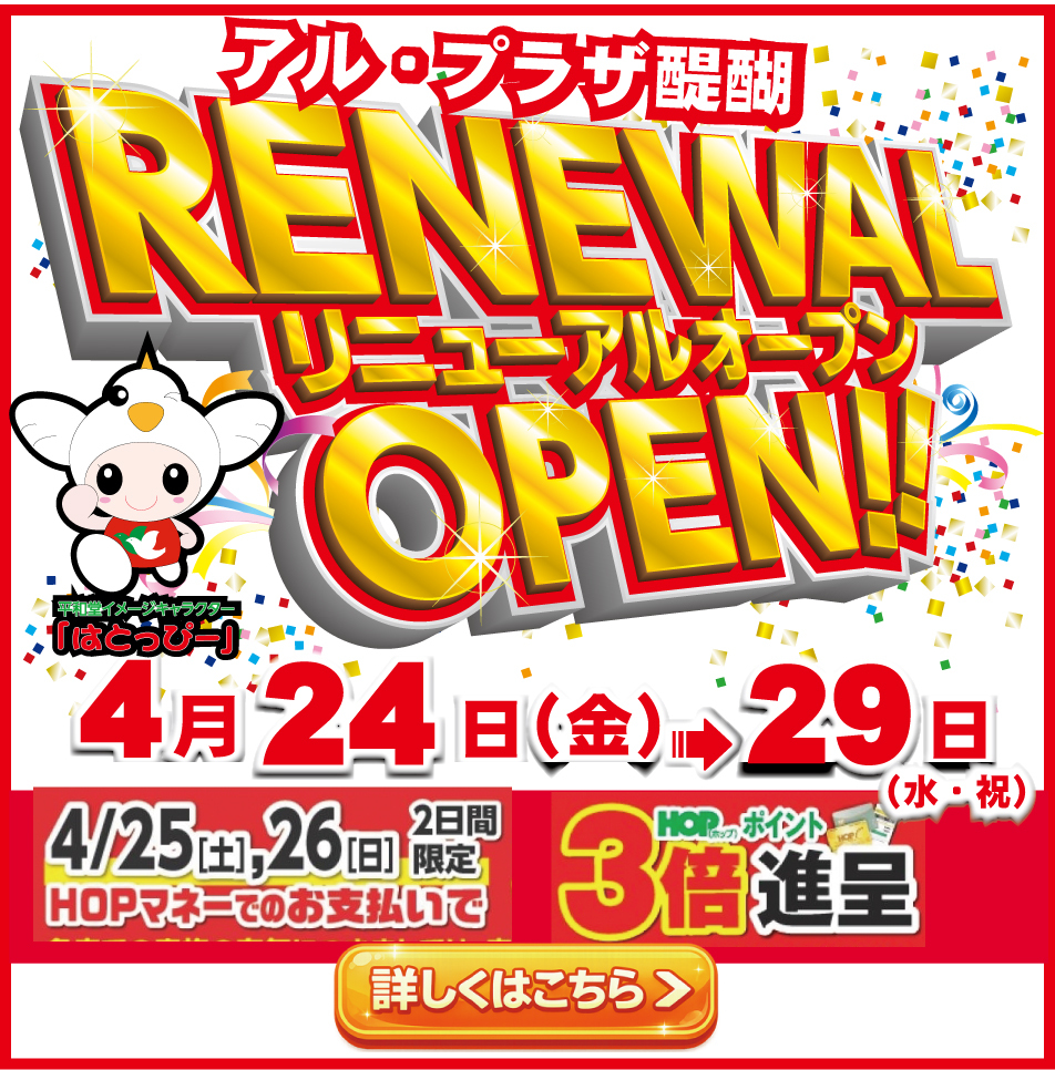 お店をさがす 求人情報 ショップニュースイベント情報インフォメーション Load More 2026-04-20 【4月25日・26日】ボール抽選会でお菓子プレゼント!お子様イベント開催 2026-04-20 【4月25日・26日】サイコロ振ってお菓子プレゼント!お子様イベント開催 2026-04-20 【4月24日(金)〜26日(日)】オリジナル缶バッジを作ろう!|2Fイベント 2026-04-20 2026年4月24日(金)〜26日(日)はとっぴーパーク開催|1Fセントラルコート 2026-04-20 【4月24日(金)〜26日(日)】「はとっぴー」がやってくる! 2026-04-20 【4月24日(金)〜26日(日)】はとっぴーパーク開催|1Fセントラルコート 2026-04-20 2026年4月29日(水・祝)新スポーツフェスタ開催|アル・プラザ醍醐 1Fセントラルコート 2026-04-20 2026年5月2日(土)〜3日(日)子どものまち なりたいナ!キッズタウン開催|アル・プラザ醍醐 2026-04-20 【5月4日(土)〜5日(日)】ちびっこ大集合!段ボールパーク開催|こどもの日イベント 2026-04-07 2026年4月22日(水) 全館 9:30~18:00|23日(木) 店休日(おやすみです) 2026-03-30 醍醐寺のお花見のあとに、アル・プラザ醍醐へ 2025-12-06 営業時間のお知らせ HOPカード関連 商品情報 くらしのサービス その他 その他 298,697 FacebookXBlueskyCopy