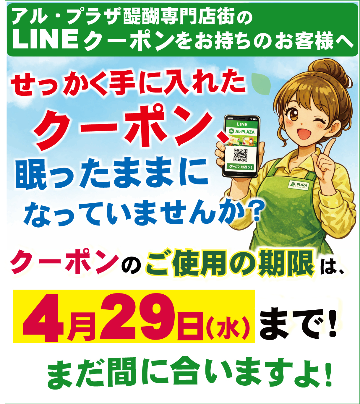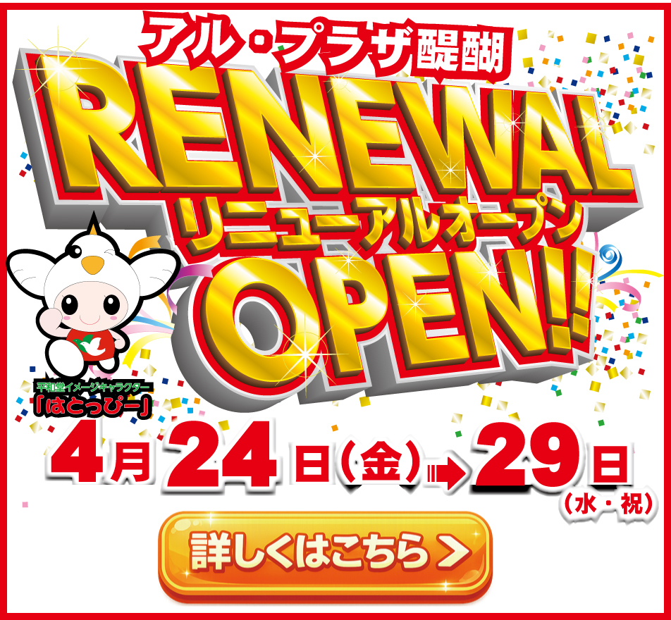 ショップニュースイベント情報インフォメーション Load More 2026-04-20 2026年4月29日(水・祝)新スポーツフェスタ開催|アル・プラザ醍醐 1Fセントラルコート 2026-04-20 2026年5月2日(土)〜3日(日)子どものまち なりたいナ!キッズタウン開催|アル・プラザ醍醐 2026-04-20 【5月4日(土)〜5日(日)】ちびっこ大集合!段ボールパーク開催|こどもの日イベント 2026-03-30 醍醐寺のお花見のあとに、アル・プラザ醍醐へ 2025-12-06 営業時間のお知らせ HOPカード関連 商品情報 くらしのサービス その他 その他 300,513 FacebookXBlueskyCopy
