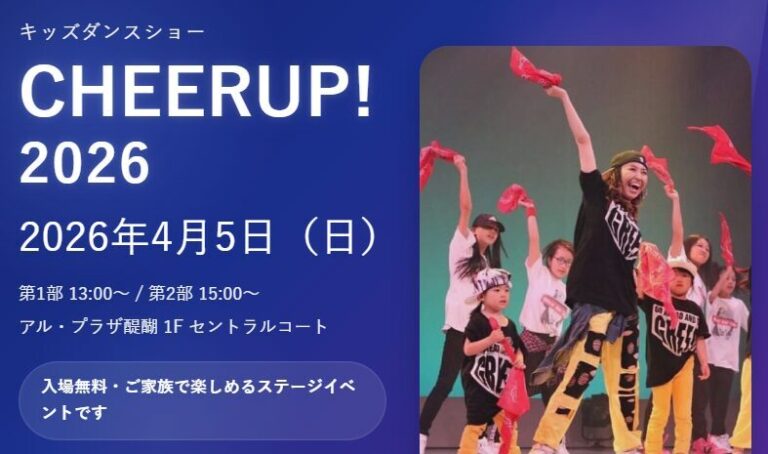 1daigojiheお店をさがす 求人情報 キッズダンスショー CHEERUP! 2026 2026年4月5日(日) 第1部 13:00〜 / 第2部 15:00〜 アル・プラザ醍醐 1F セントラルコート 入場無料・ご家族で楽しめるステージイベントです ▶ イベントを見る ショップニュースイベント情報インフォメーション Load More 2026-04-02 4月5日(日)アル・プラザ醍醐でキッズダンスショー「CHEERUP! 2026」開催 2026-04-02 【4月4日・5日】わなげで遊んでお菓子プレゼント!お子様イベント開催 2026-04-02 【4月4日・5日】ボール抽選会でお菓子プレゼント!お子様イベント開催 2026-04-02 【4月11日・12日】わなげで遊んでお菓子プレゼント!お子様イベント開催 2026-04-02 【4月11日・12日】ボール抽選会でお菓子プレゼント!お子様イベント開催 2026-04-02 【4月18日・19日】サイコロ振ってお菓子プレゼント!お子様イベント開催 2026-04-02 【4月18日・19日】ボール抽選会でお菓子プレゼント!お子様イベント開催 2026-04-02 【4月25日・26日】サイコロ振ってお菓子プレゼント!お子様イベント開催 2026-04-02 【4月25日・26日】ボール抽選会でお菓子プレゼント!お子様イベント開催 2026-03-30 醍醐寺のお花見のあとに、アル・プラザ醍醐へ 2025-12-06 営業時間のお知らせ HOPカード関連 商品情報 くらしのサービス その他 その他 293,518 FacebookXBlueskyCopy