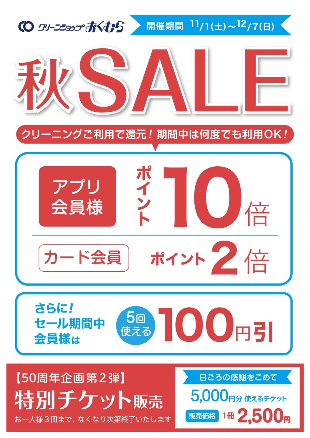 クリーンショップおくむらは、おかげさまで創業50周年を迎えました。日頃のご愛顧に感謝を込めて、秋の大感謝セールを開催いたします。