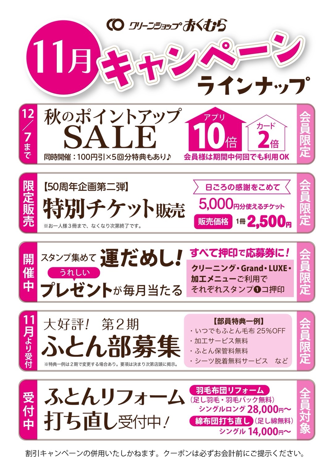 2025年11月のクリーンショップおくむらのキャンペーンです。ご覧ください。