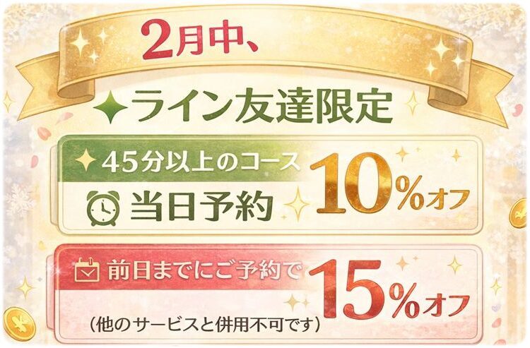 2月中は、LINE友達の方限定で、45分以上のコースをご利用いただいた方を対象に、お得な割引をご用意しております。