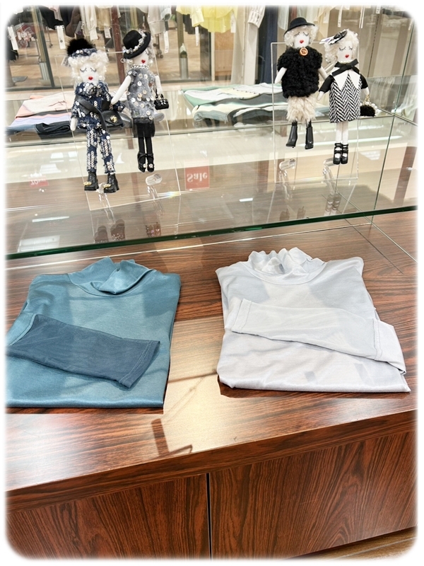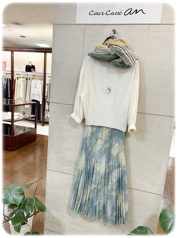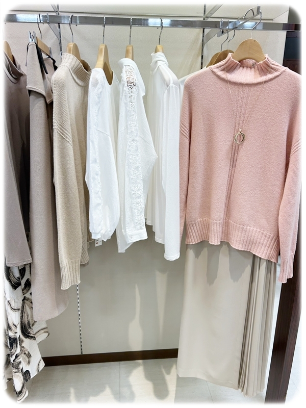 やわらかな色合いのトップスやボトムスは、落ち着いた雰囲気で大人の装いにぴったり。
