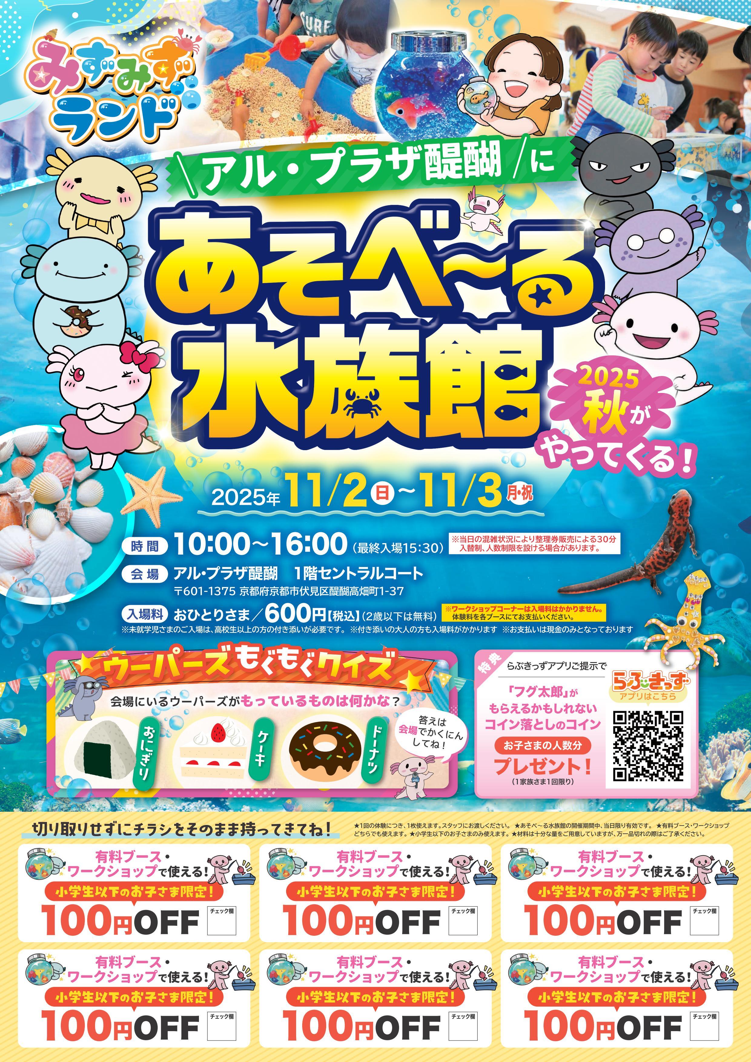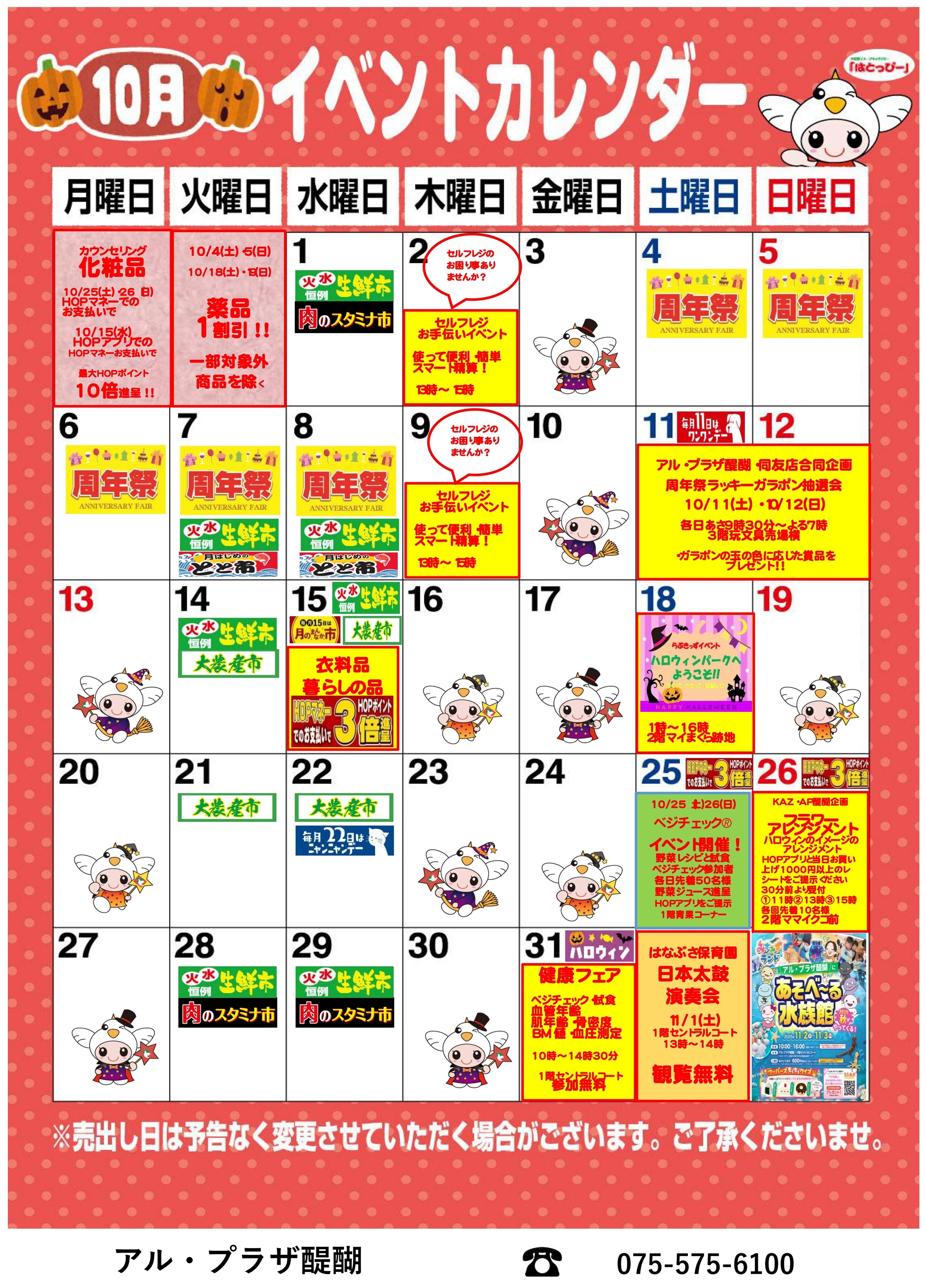 こちらのページでアル・プラザ醍醐(平和堂)のセールやイベントなどの情報を掲載させていただきます。 2025年10月度 売り出し日は、予告なく変更させていただく場合がございます。ご了承くださいませ。 パソコンでご覧の方はPDF版をご用意しました。 下記ボタンをクリックしてください。 ※同じページで開きますので、元のページに戻る時は、ブラウザの「戻る矢印」を押して下さい。 アル・プラザ醍醐にあそべーる水族館がやってくる。 2025年11月2日(日)、11月3日(月・祝) >>移動水族館みずみずランドとは >別ページで開きます。 PCでご覧の方はPDF版はコチラ!> アル・プラザ醍醐・同友店合同企画 周年祭ラッキーガラポン抽選会 10月11日(土)・10月12日(日) 28,515 FacebookXBlueskyCopy