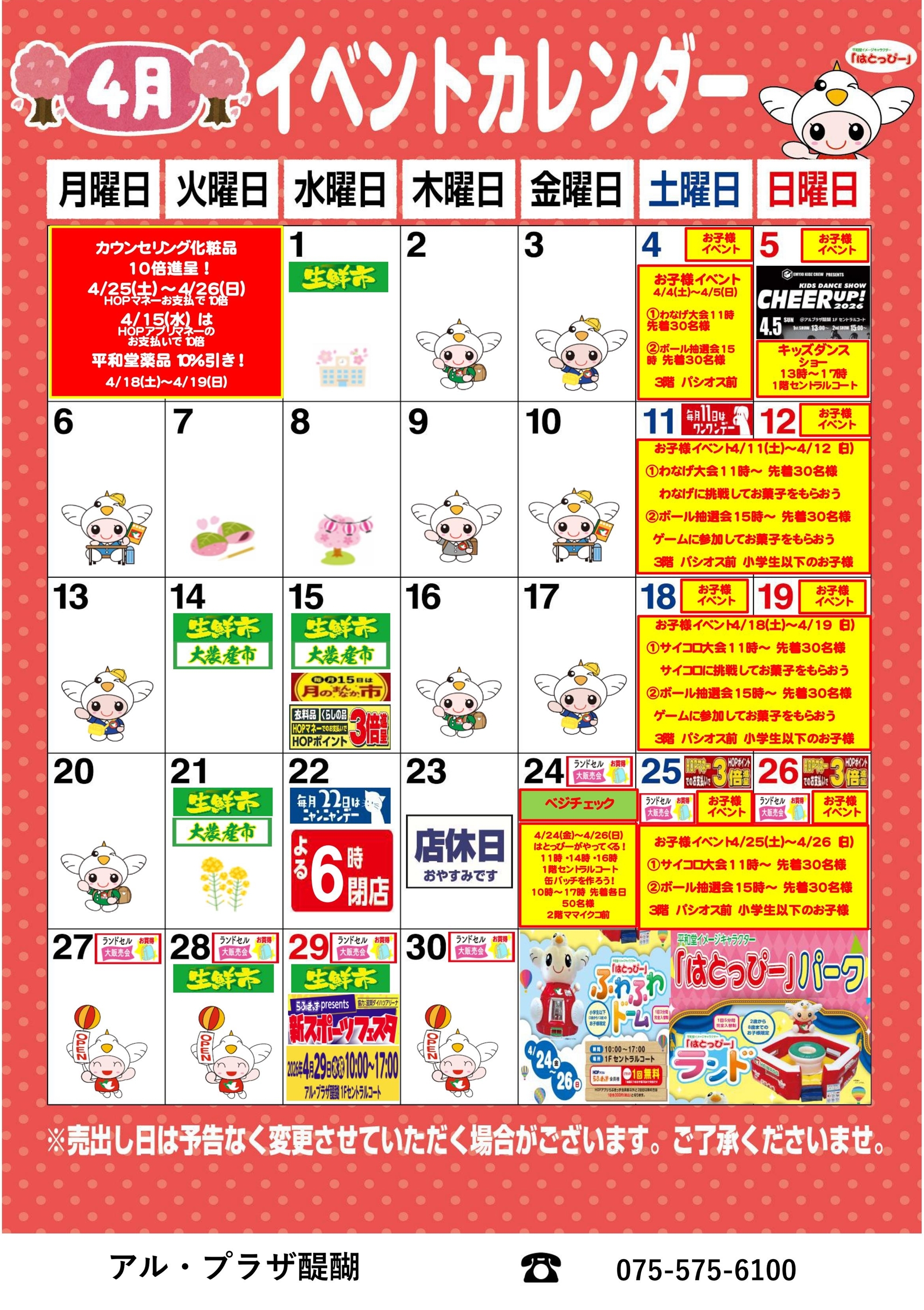 2026年4月度 売り出し日は、予告なく変更させていただく場合がございます。ご了承くださいませ。 パソコンでご覧の方はPDF版をご用意しました。 下記ボタンをクリックしてください。 ※同じページで開きますので、元のページに戻る時は、ブラウザの「戻る矢印」を押して下さい。 2026年4月イベントカレンダー↓ 平和堂イベントなど 2026-04-02 【4月18日・19日】サイコロ振ってお菓子プレゼント!お子様イベント開催 2026-04-02 【4月18日・19日】ボール抽選会でお菓子プレゼント!お子様イベント開催 2026-04-02 【4月25日・26日】サイコロ振ってお菓子プレゼント!お子様イベント開催 2026-04-02 【4月25日・26日】ボール抽選会でお菓子プレゼント!お子様イベント開催 8,033 FacebookXBlueskyCopy