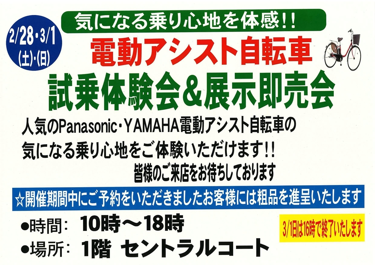 2/28(土)・3/1(日)10:00〜18:00 電動アシスト自転車 試乗体験会&展示即売会(※3/1は16:00まで)
