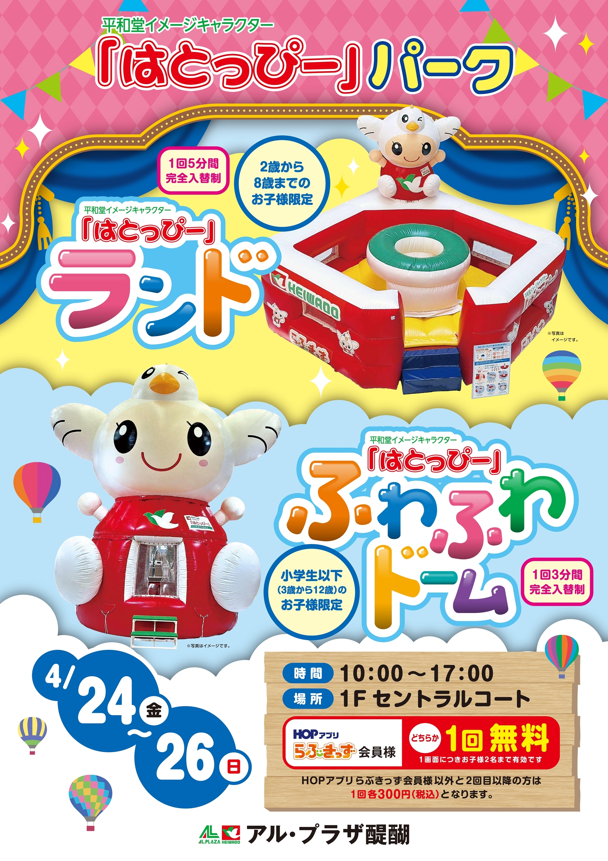 2026年4月24日(金)〜26日(日)の3日間、アル・プラザ醍醐 1Fセントラルコートにて、平和堂イメージキャラクター「はとっぴー」のイベント「はとっぴーパーク」を開催いたします。