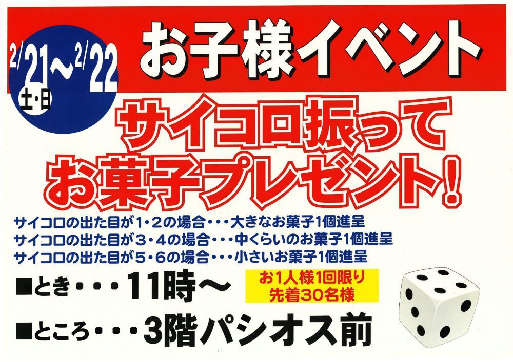 2月21日(土)・22日(日)11時~|サイコロ回振ってお菓子プレゼント!お子様イベント