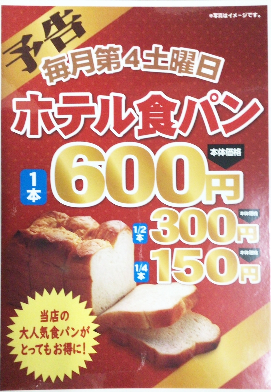 毎月ご好評をいただいている「ホテル食パン 600円(税抜)」の日は、