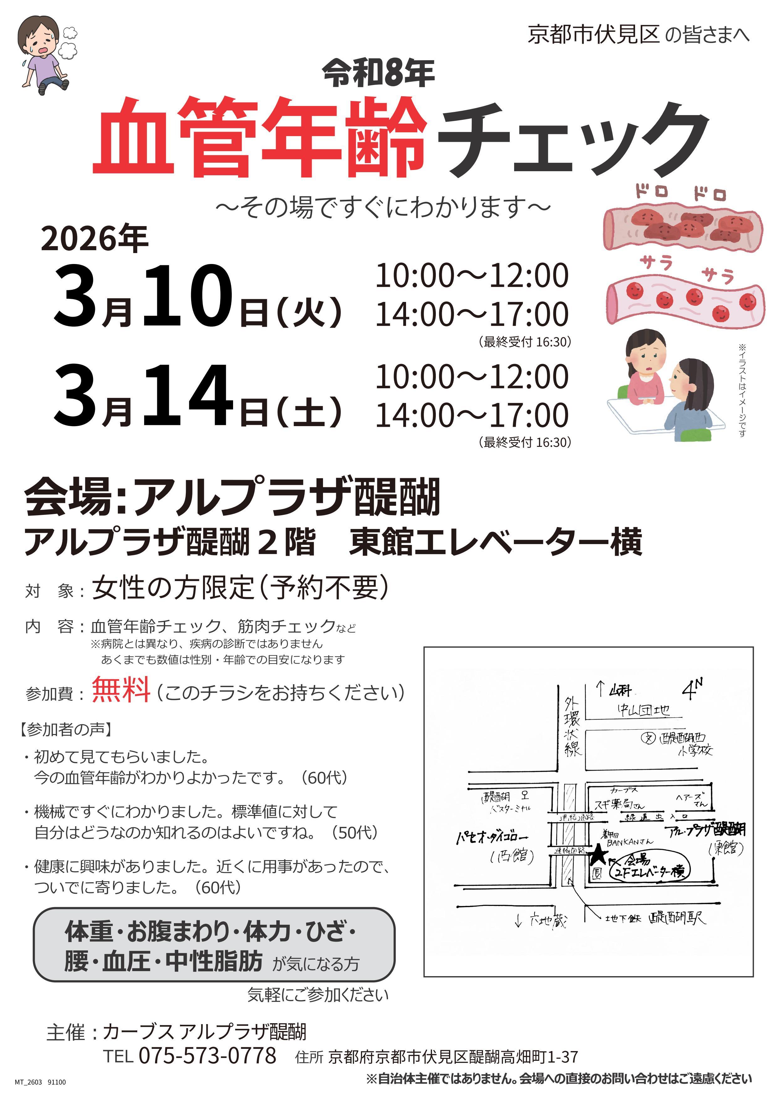 【参加無料】血管年齢チェック開催(3/10火・3/14土)|アル・プラザ醍醐 東館2階(女性限定)