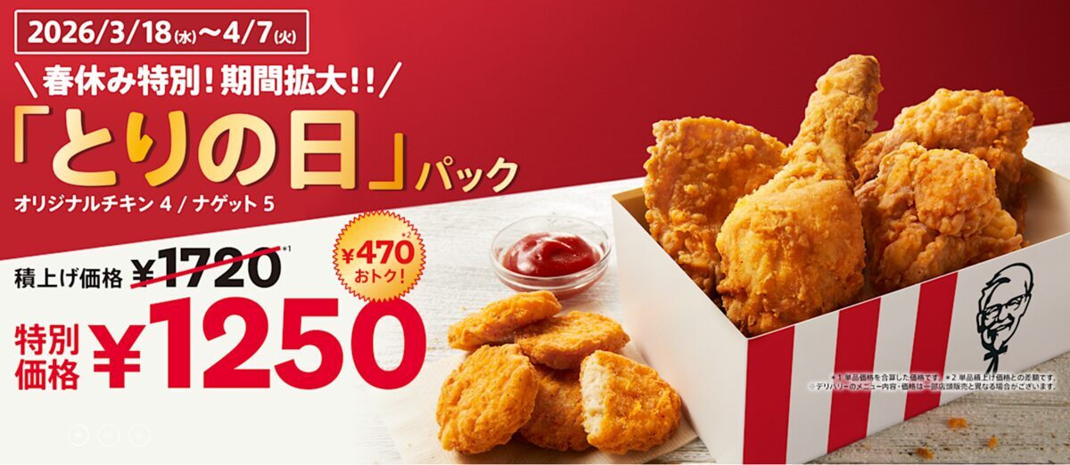【3/18〜4/7】春休みは毎日おトク!ケンタッキー「とりの日パック」販売中!|ケンタッキーフライドチキン(1階)