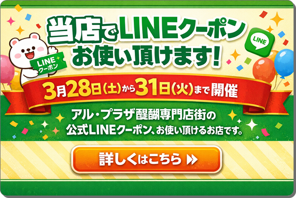 3月28日(土)から31日(火)まで開催のアル・プラザ醍醐専門店街の公式LINEクーポン、お使い頂けるお店です。