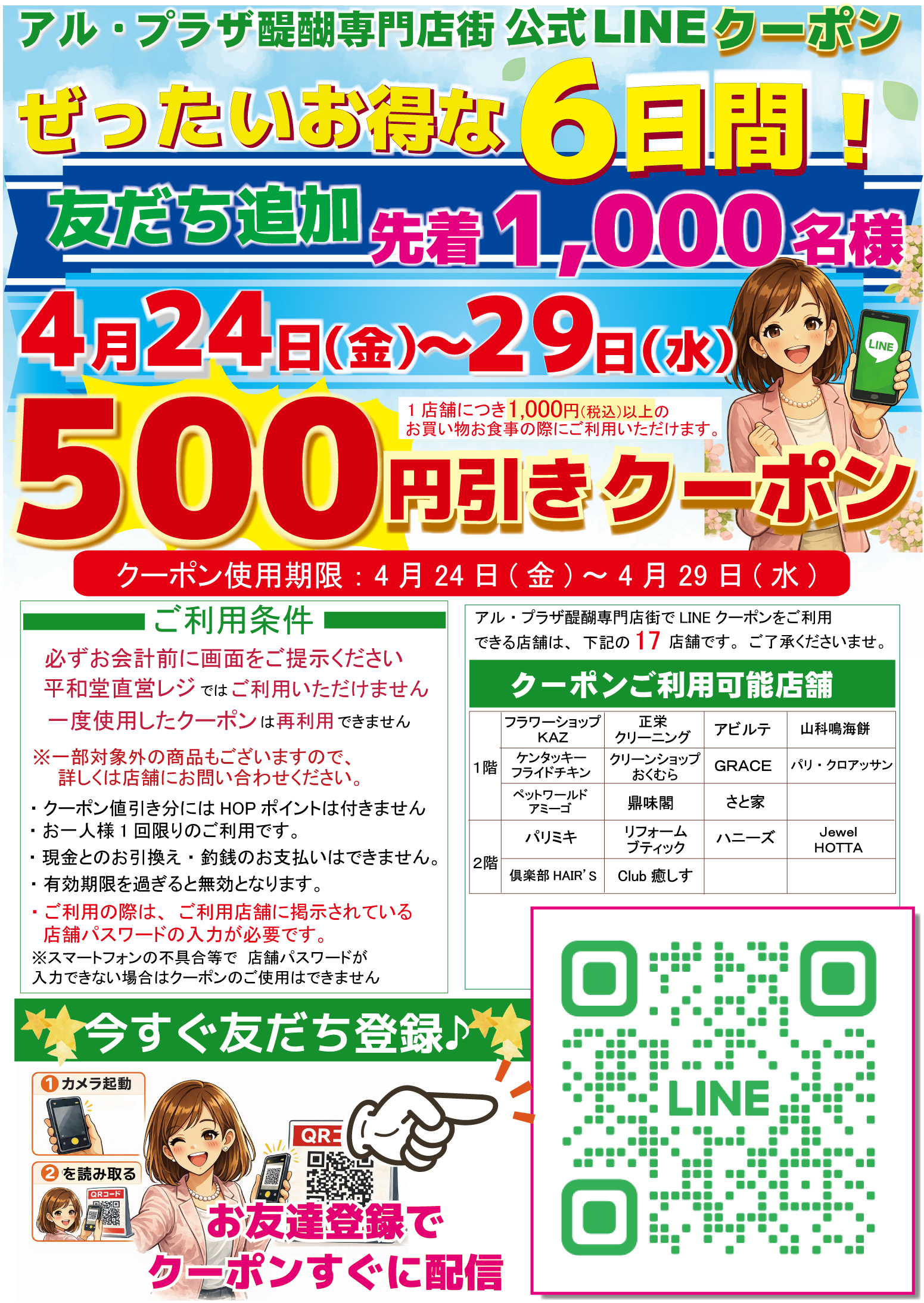 アル・プラザ醍醐専門店街 LINEクーポン企画スタート|公式LINEにお友達登録で、先着1,000名様 500円引きクーポン配信!