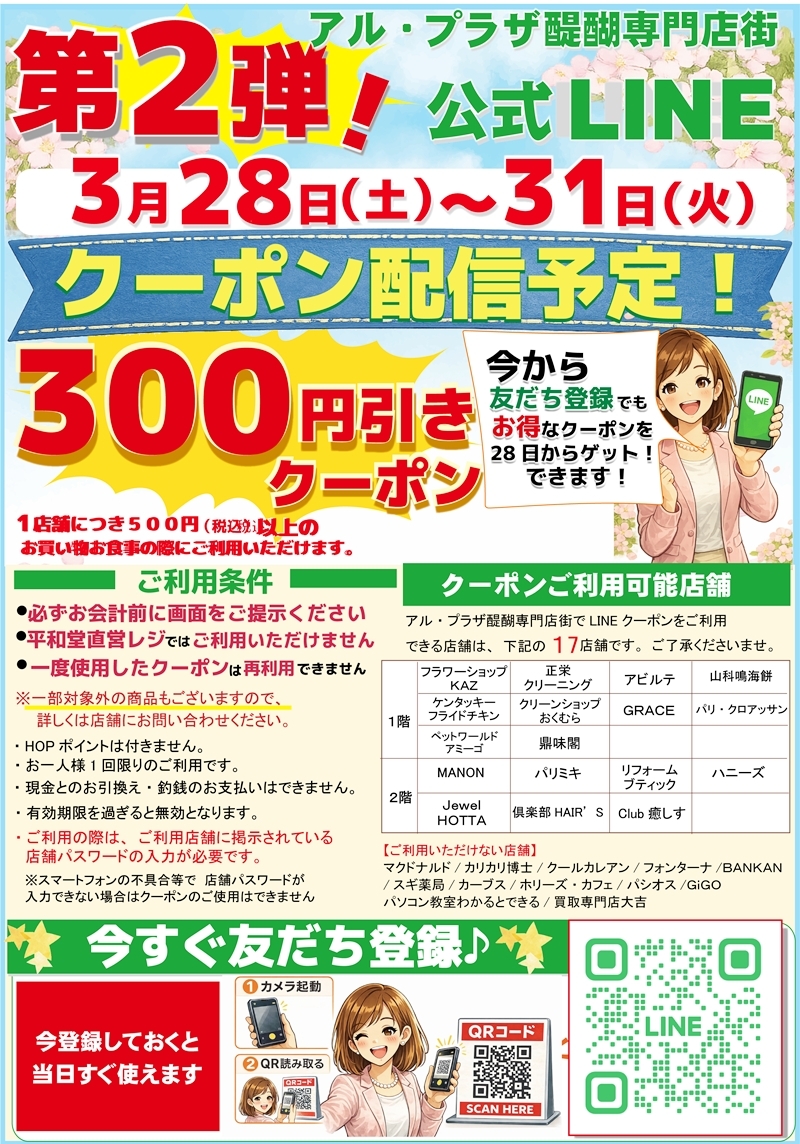 期間中にご登録いただいた方も対象となりますので、まだご登録がお済みでない方は、ぜひこの機会にアル・プラザ醍醐専門店街公式LINEへご登録ください。