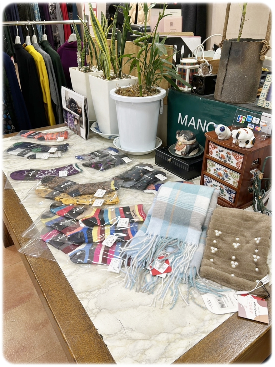 店内には、ストールやソックス、ルームシューズなどの小物類も並んでいます。