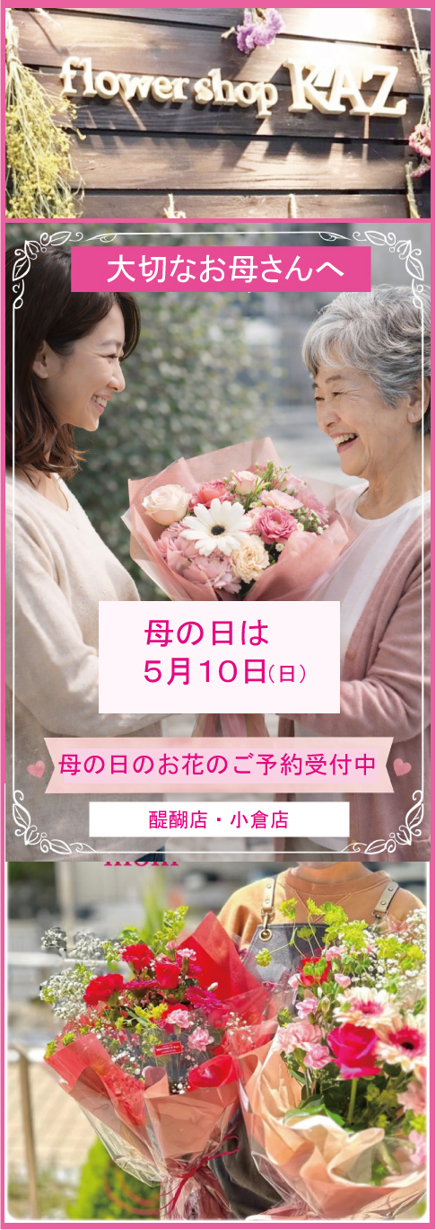 京都市伏見区、伏見、醍醐、六地蔵周辺で、母の日の花やプレゼントをお探しの方は、ぜひフラワーショップKAZへ。