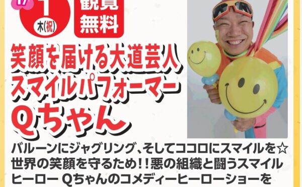 2025年12月21日既に終了の過去のイベントアル・プラザ醍醐専門店 2026年新春お楽しみイベント|【1月1日(木・祝)】笑顔を届ける大道芸人 スマイルパフォーマーQちゃん パフォーマンスショー2026年1月1日(木・祝)、アル・プラザ醍醐で開催される新春お楽しみイベント。笑顔を届ける大道芸人「スマイルパフォーマーQちゃん」による観覧無料のパフォーマンスショーをお楽しみください。