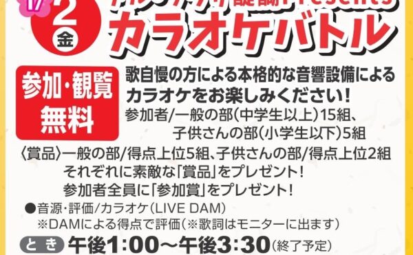 2025年12月21日既に終了の過去のイベントアル・プラザ醍醐専門店 2026年新春お楽しみイベント|【2026年1月2日(金)】アル・プラザ醍醐Presents カラオケバトル2026年1月2日(金)、アル・プラザ醍醐で開催される新春お楽しみイベント「カラオケバトル」。参加・観覧無料。本格的な音響設備で歌自慢の方が競い合います。