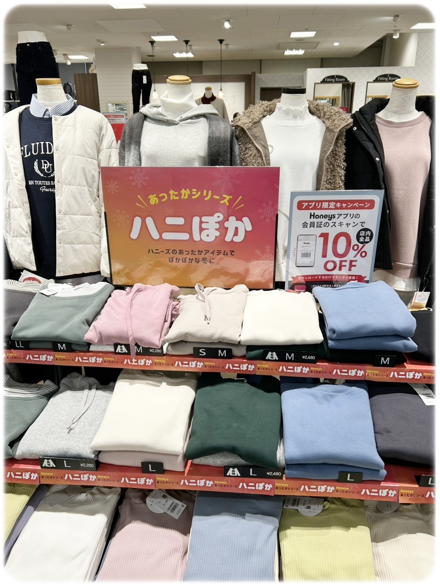 ハニーズ(Honeys)(2階)|ハニーズのあたたか冬アイテム|見た目すっきりの裏地あったか素材のハニぽかシリーズで、冬のおしゃれをもっと楽しく!