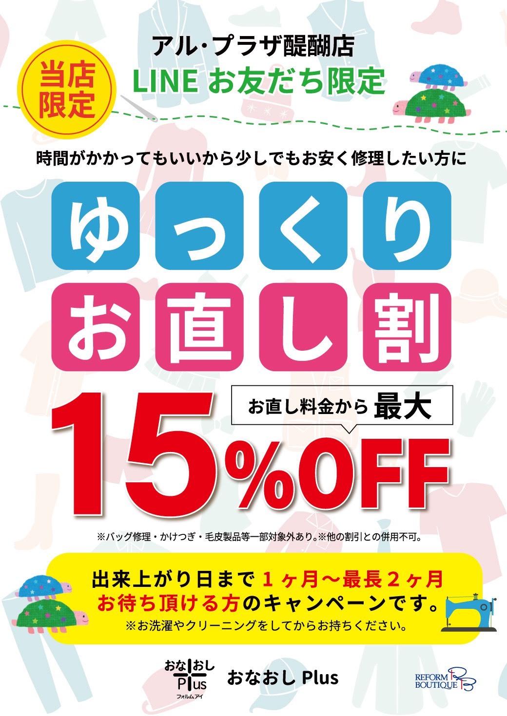 『リフォームブティック アル・プラザ醍醐店』では、LINEお友だち限定で、お急ぎでない“洋服のお直し”を期間限定で、15%OFFにて承っております!