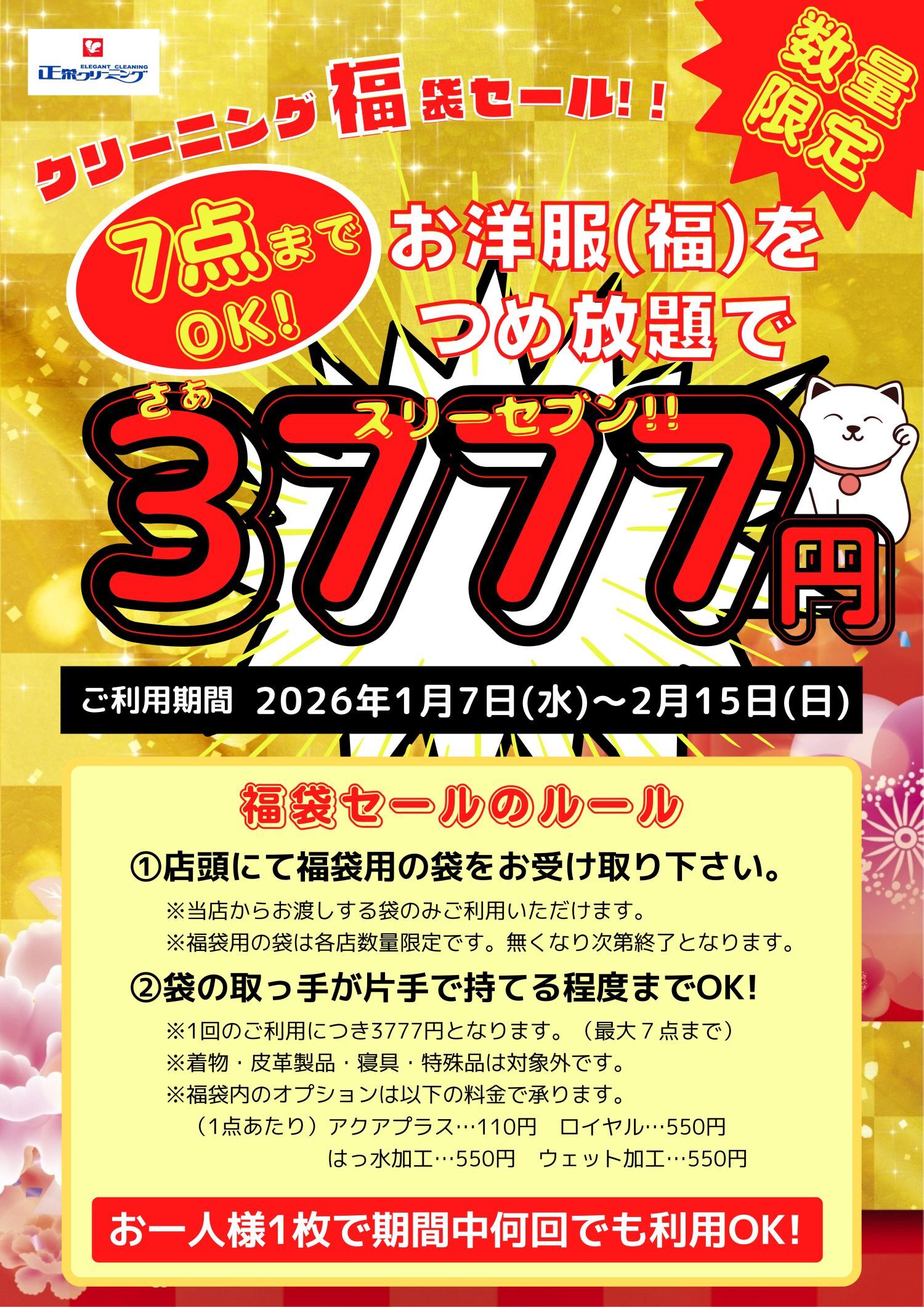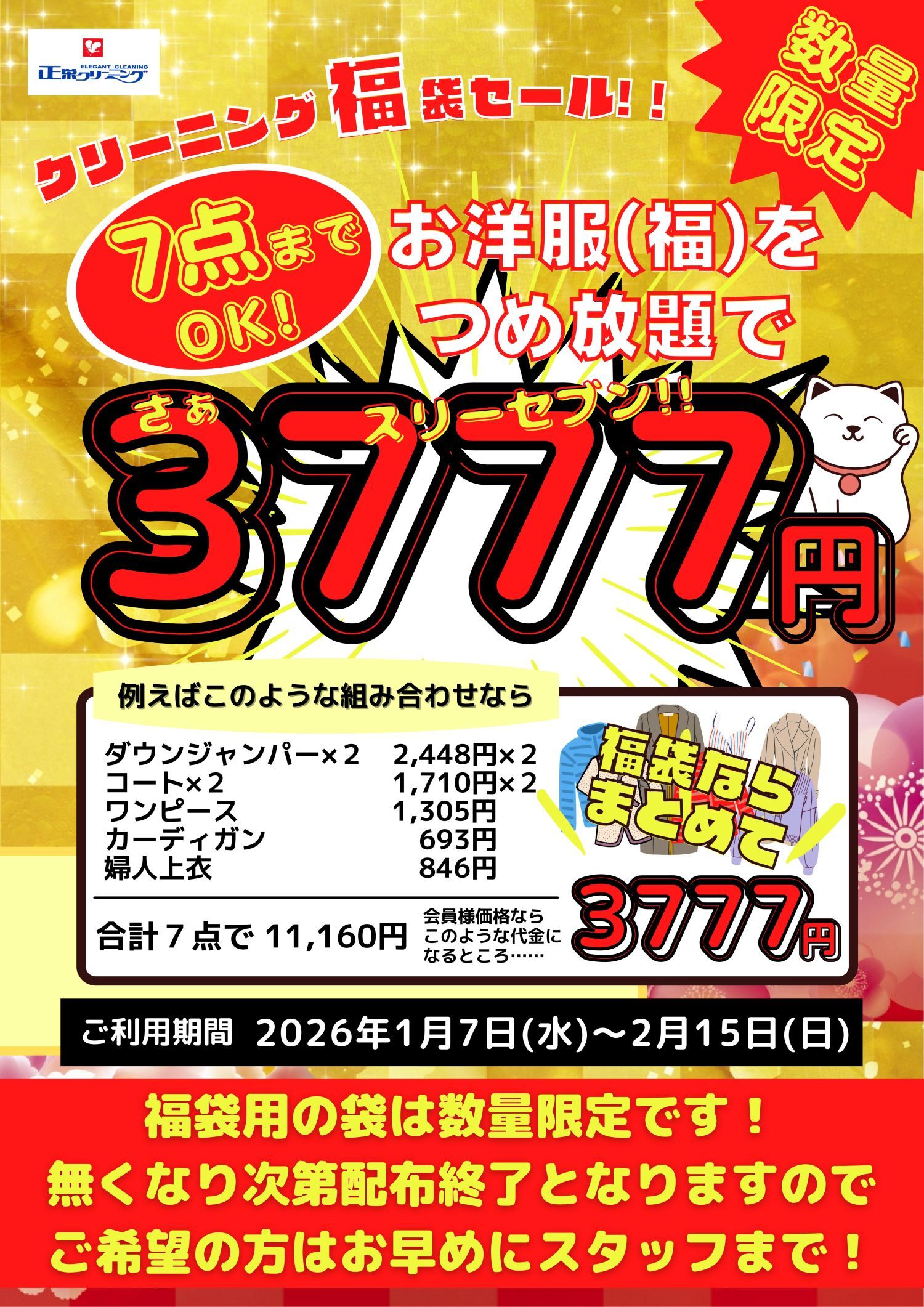 正栄クリーニング(1階)クリーニング福袋セール!!数量限定 7点までOK! お洋服(福)を つめ放題で さぁ スリーセブン!!3777円