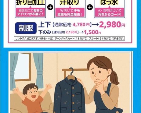 NEW 2025年12月12日総合アル・プラザ醍醐専門店 伏見区醍醐の学生服クリーニング クリーンショップおくむら 醍醐店(1階)|冬休み20%OFFで家事ラク冬休み中がラクでお得|伏見区醍醐で学生服クリーニングを出すなら今京都市伏見区醍醐で学生服クリーニングを検討中のお母さんへ。冬休みキャンペーンで20%OFF。折り目加工・汗取り・はっ水のトリプル加工が特別価格。上下2,980円、下のみ1,500円。