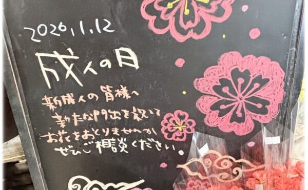 NEW 2026年1月10日総合アル・プラザ醍醐専門店 フラワーショップKAZ(カズ)1階|1月12日は成人の日|お祝いの花束・アレンジメント承ります1月12日は成人の日。成人式のお祝いに花束・アレンジメントのご注文を承ります。色やご予算のご相談もお気軽にどうぞ。ラストオーダーは19:30まで。